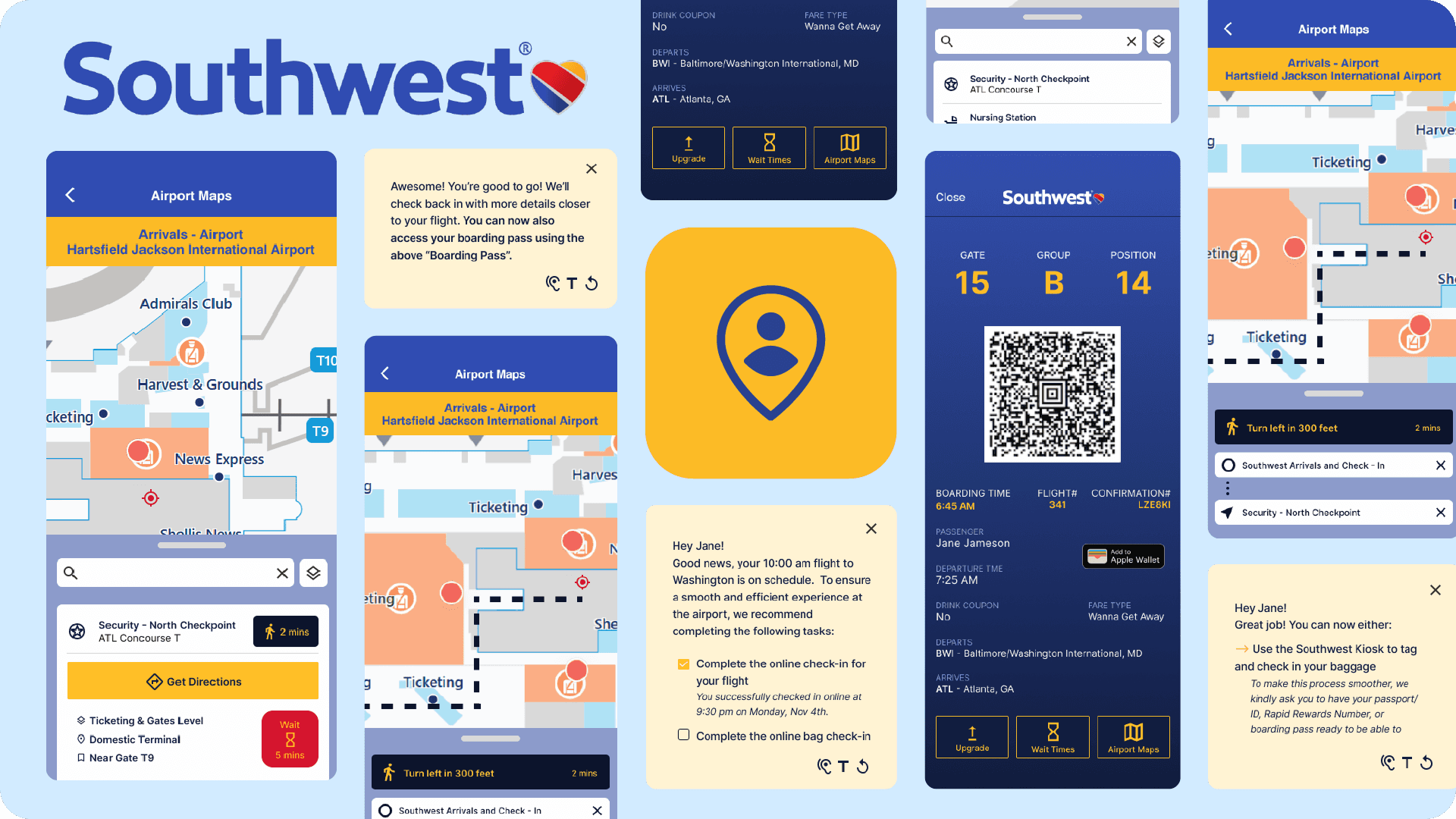 A concept redesign of the Southwest Airlines app introducing a virtual walkthrough to help travelers navigate pre-flight tasks and airport spaces.