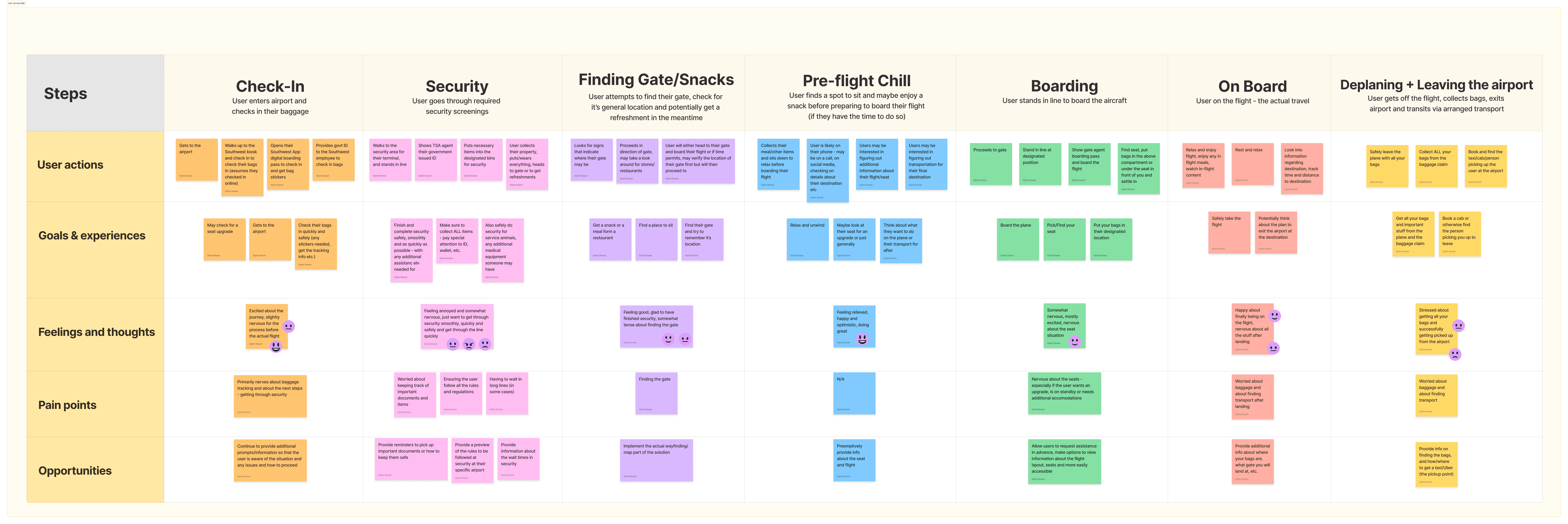 This helped identify emotional states, user needs, and points of confusion across each stage of the journey - from pre-check-in to boarding. The analysis revealed several key insights: